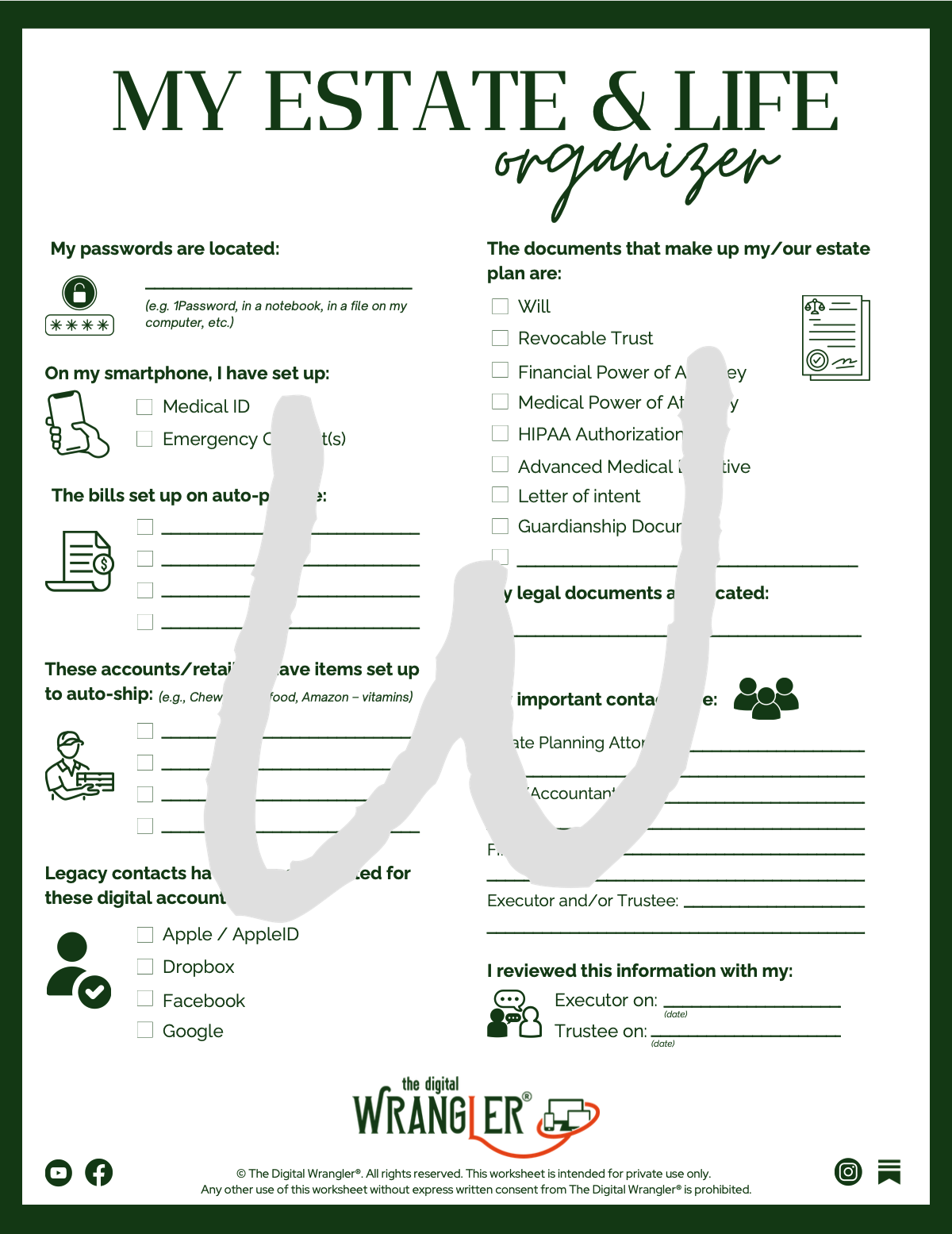 The My Estate & Life Organizer worksheet by The Digital Wrangler® is a practical, fill-in-the-blank tool that helps individuals organize key estate planning details like legal documents, passwords, auto-payments, legacy contacts, and emergency info. It serves as a centralized summary to make it easier for loved ones to locate and access important information when it's needed most.